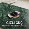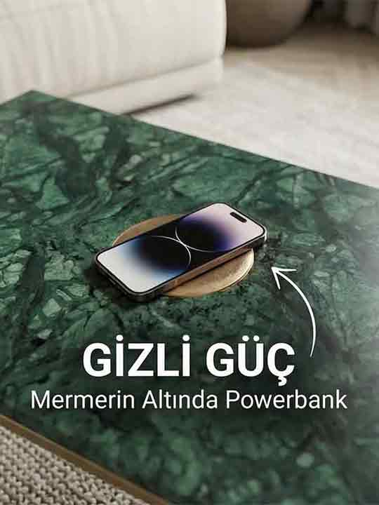Gizli Şarj İstasyonu: Mermer tablanın altına özel olarak entegre edilmiş powerbank sistemi sayesinde, cihazlarınızı sadece sehpanın üzerine bırakarak şarj edebilirsiniz.